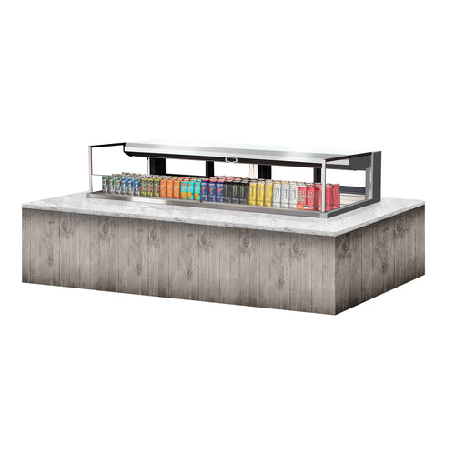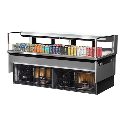 Drop-In Horizontal Open Display Case, low profile, 9.7 cu. ft. capacity, 71-7/8"W x 33-3/4"D x 37-3/4"H,, self-contained refrigeration with self-cleaning condenser, deck only, tempered glass front shield & side walls, rear sliding glass doors, solar digital thermometer, digital electronic thermostat with defrost control, LED interior lighting, stainless steel interior, specify exterior color, front air intake & rear air discharge, includes night cover, R290 Hydrocarbon refrigerant, (4) 3/4 HP, 220v/60/1-ph, 13.0 amps, cord with NEMA 6-20P, cETLus, ETL-Sanitation