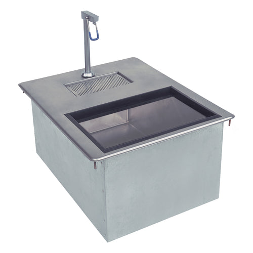 Special Value Ice & Water Unit, drop-in, single service, 18” x 21” overall (ice bin 18” x 13.5” x 12”), 1" diameter drain, stainless steel sliding removable cover, drip pan drain 1" dia., water cold 1/2" I.P.S., cut out size 15-1/4" x 20-5/8", 50-lb ice capacity, NSF