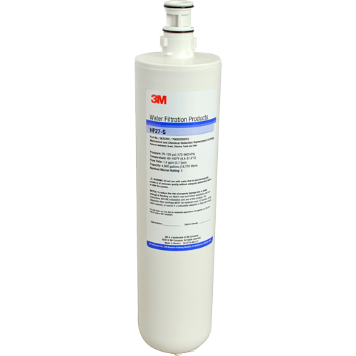 Water Filter Cartridge, high flow beverage, 14" x 3", 4800 gallon capacity, 1.5gpm, 25-125psi/172-862 KPA, 5 micron filtration, 40° to 100° F temperature range, (2) O-rings, sediment, scale, chlorine taste/odor, white, plastic cartridge housing, (HF27-S), 3M®