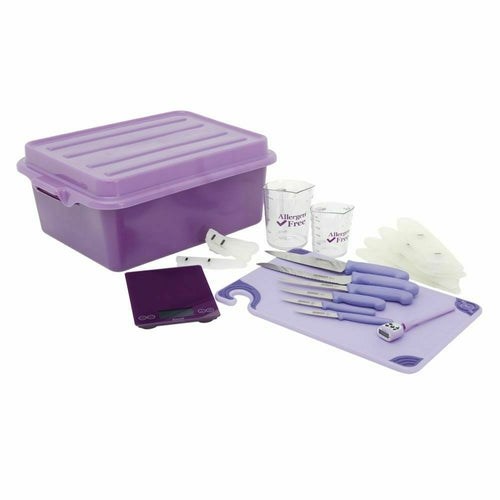 Allergen Food Prep Kit, 19-piece, includes: (1) 20" x 15" x 7"H purple Colormate food box (91946), (1) purple Colormate snap-on lid (99418), (3) 3-4" blade safe knife covers (40519), (1) 4-6" blade safe knife cover (94763), (2) 8-10" blade safe knife cover (50004), (1) allergen purple cutting board (75341), (1) purple digital thermometer (40653), (2) 3-1/2" purple paring knife (21204), (1) 9" offset purple boning knife (19615), (1) 9" offset purple bread knife (58629), (1) 5" serrated purple utility/produce (81869), (1) 8" purple cook's knife (32476), (1) purple glass digital scale 15 lbs. x 0.1 oz. (97000), (1) 1 pint measuring cup (87105), (1) 1 quart measuring cup (19488)