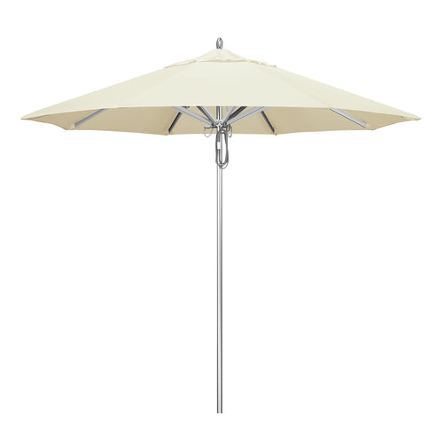 Rodeo Series Patio Umbrella, 9 ft., octagonal, single wind vent, 1-1/2" dia. aluminum silver anodized pole, single piece with 3mm wall thickness, stainless steel hardware, pulley lift, oversized reinforced aluminum rib joints with stainless steel spring loaded tips, polished aluminum hub, housing and finial cap, Grade 1A Sunbrella® Fabric, canvas, Made in USA
