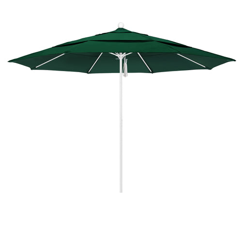 Venture Series Patio Umbrella, 11 ft., octagonal, double wind vent, 1-1/2" dia. textured matted white aluminum pole, 2-piece with 2mm wall thickness, 12.7mm reinforced fiberglass ribs, push lift with pin stop, stainless steel hardware, zinc plated hub & housing, Grade 1A Sunbrella® Fabric, forest green, Made in USA