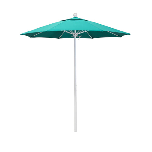 Venture Series Patio Umbrella, 7-1/2 ft., octagonal, single wind vent, 1-1/2" dia. textured matted white aluminum pole, 2-piece with 2mm wall thickness, 12.7mm reinforced fiberglass ribs, push lift with pin stop, stainless steel hardware, zinc plated hub & housing, Grade 1A Sunbrella™ Fabric, aruba, Made in USA