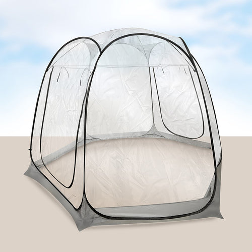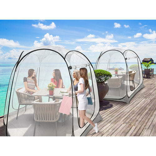 Pop Up Dining Pod, with tent, 10' x 10' x 6-3/5'H O.D. (8-1/2' x 8' x 1/2' I.D.), 80" center height, portable, (2) entrances with zippers, for a table with 4-6 people, supporting clips on all sides, compact fold away, PVC, clear (no tools required for assembly)