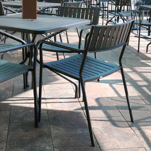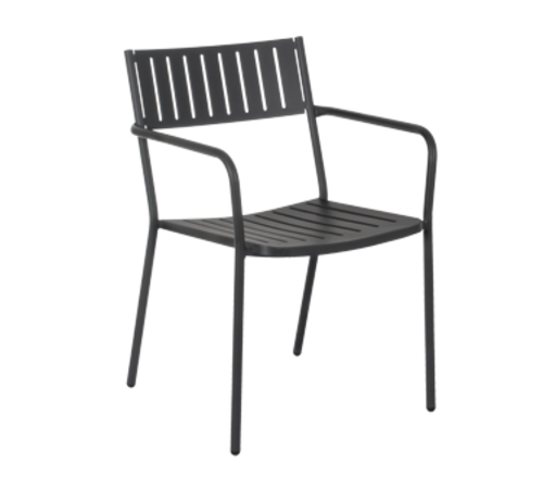 Bridge Stacking Armchair, outdoor/indoor, steel slat back and seat, tubular steel frame, e-coated steel with powder coat finish, foot caps