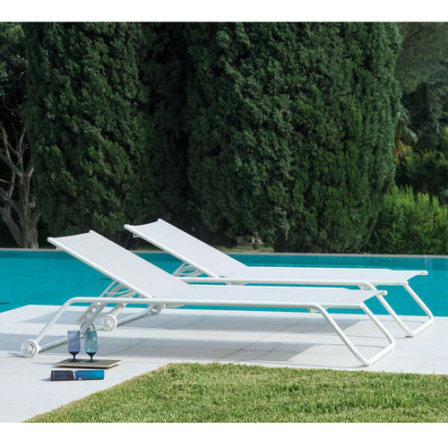 Snooze Chaise, stackable, outdoor/indoor, textilene fabric back and seat, steel frame, designed by Chiaramonte/Marin