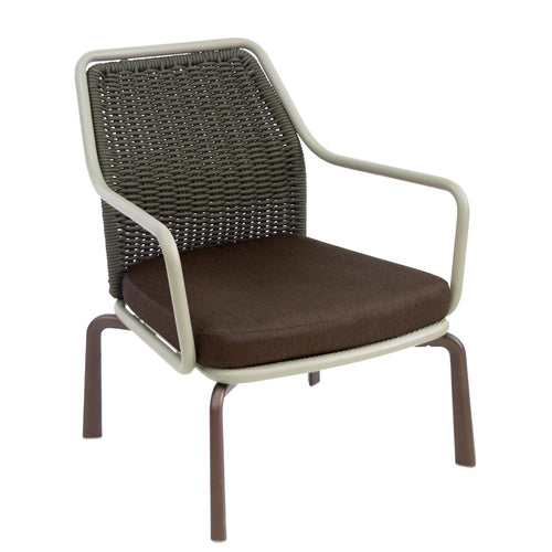 Cross Lounge Arm Chair, outdoor/indoor, solid seat and rope back, tubular frame, e-coated steel, powder coat finish, PVC foot caps