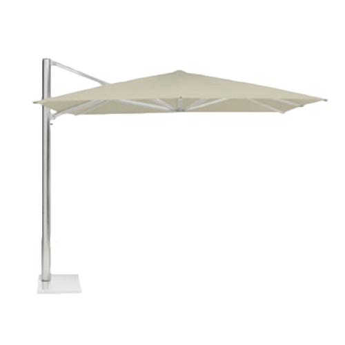 Shade Cantilever Umbrella, 10 ft., square top, 5-1/2" dia. side post, anodized aluminum pole, ribs, struts, hubs, and finial, crank lift, 4 position rotational locking mechanism, two canopy positions, with vent, pocket less canopy attachment, all repairable construction, 540 lb. white metal cover base over (4) granite plates, assembly required
