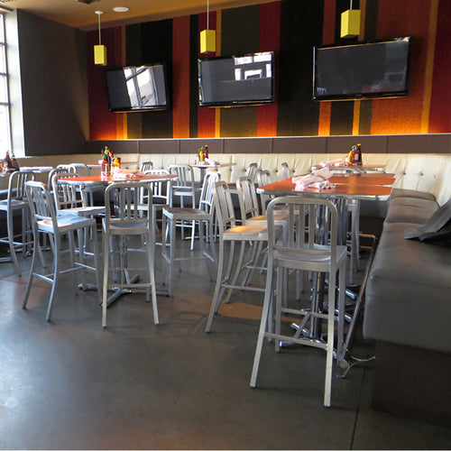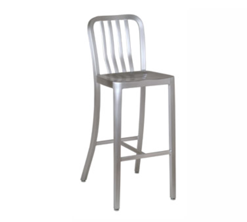 Anna Barstool, outdoor/indoor, slat back, saddle seat, brushed aluminum with clear lacquer coat, foot rest, PVC foot caps