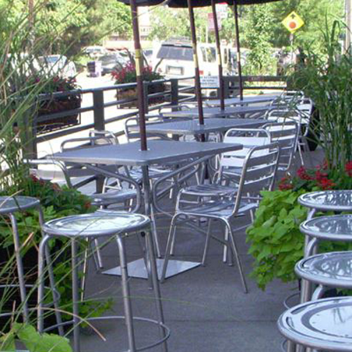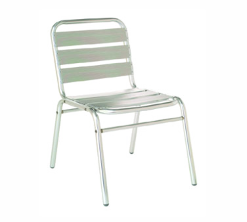 Flora Stacking Side Chair, outdoor/indoor, slat back and seat, polished aluminum, PVC foot caps