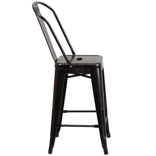 Bar Stool, 500 lb. weight capacity, counter height, curved back with vertical slat, drain hole in seat, cross brace under seat, galvanized steel, powder coat finish, footrest, plastic floor glides, lightweight, designed for indoor/outdoor commercial and residential use, black and antique gold (assembly required) (in stock items usually ship within 24 hours)
