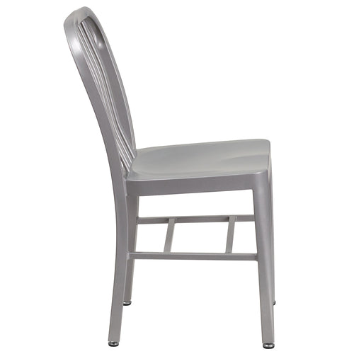 Chair, 500 lb. weight capacity, vertical slat back, galvanized steel, powder coat finish, adjustable floor glides, designed for indoor/outdoor commercial and residential use, silver (in stock items usually ship within 24 hours)