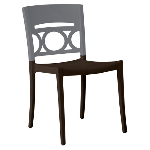 Moon Stacking Side Chair, design resined for outdoor use, circular moon design resin back, resin seat and frame, recyclable, ASTM rated, titanium gray, charcoal, Made in USA (priced per each, packed 16 each per case)