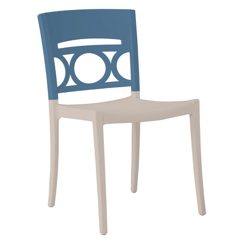 Moon Stacking Side Chair, design resined for outdoor use, circular moon design resin back, resin seat and frame, recyclable, ASTM rated, denium blue/linen, Made in USA (priced per each, packed 16 each per case)