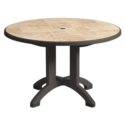 Aquaba Outdoor Table, 48" round, toscana design table top, umbrella hole with cap, charcoal balcony legs, power washable, recyclable, UV resistant resin, Made in USA