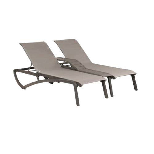 Sunset Duo Chaise Lounge, stackable, textilene fabric sling, with Microban® anti-microbial treatment, aluminum platinum gray center console with 2-layer shelves, air molding technology resin, UV and rust resistant, recyclable, ASTM rated, platinum gray frame, recessed wheels, solid gray fabric , Made in USA