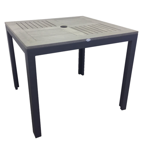 Table, square, 36" x 36", dining height, outdoor use, gray perma-wood™ top with umbrella hole, welded aluminum corner legs with dark gray powder coat finish, weather-proof, antique gray brushed faux teak