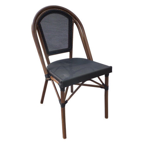Antigua Side Chair, stackable, designed for outdoor/indoor use, black textilene fabric back & seat, cappuccino aluminum frame