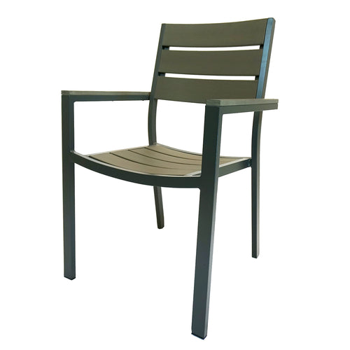 Durango Dining Arm Chair, stackable, designed for outdoor/indoor use, faux wood ladder back & seat, aluminum frame