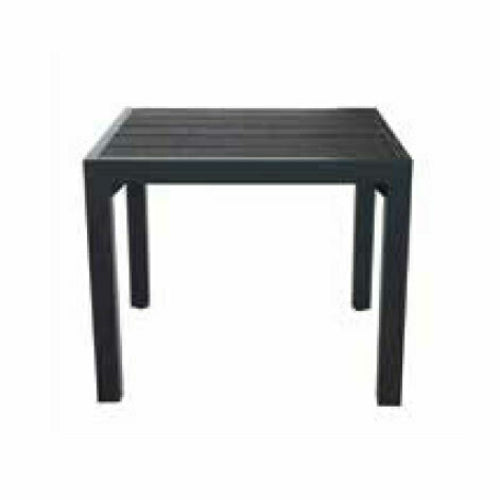Durango Side Table, light gray faux wood slat table top, tubular aluminum frame, gunmetal finish