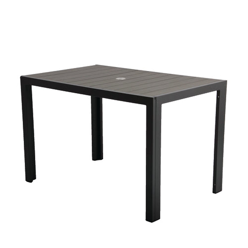 Durango Table, rectangular, 30" x 53", dining height, faux wood slat table top, with umbrella hole, designed for outdoor/indoor use, aluminum frame