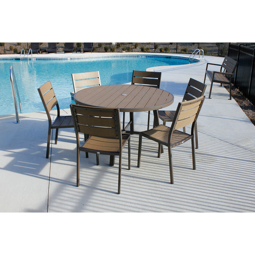 Durango Table, round, 36" dia., dining height, faux wood slat top, with umbrella hole, designed for outdoor/indoor use, aluminum frame