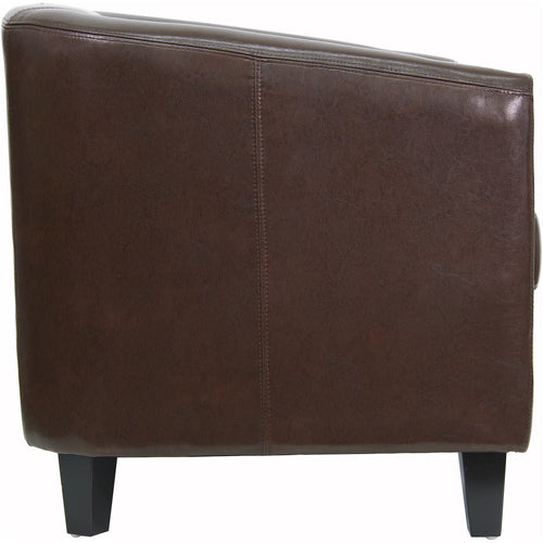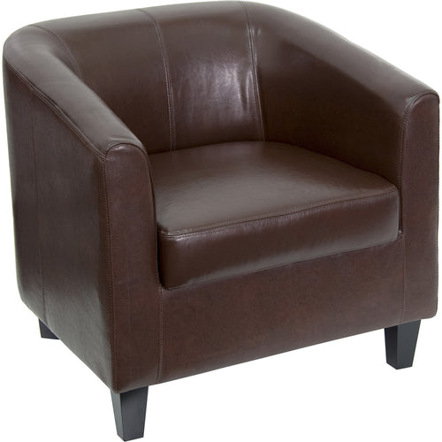 Office Guest/Reception Chair, 250 lb. weight capacity, sloping arms, barrel back, tailored stitching, LeatherSoft upholstery, fixed seat cushion, dense foam padded seat, CA117 fire retardant foam, solid inner hardwood frame construction, black wood legs, brown (assembly required) (in stock items ship within 24 hours)