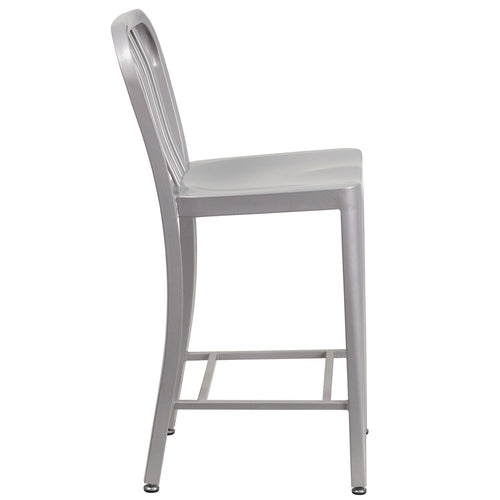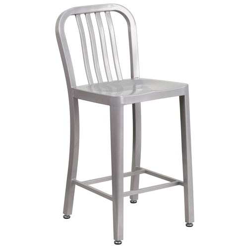 Bar Stool, 500 lb. weight capacity, counter height, vertical slat back, galvanized steel, powder coat finish, footrest, adjustable floor glides, designed for indoor/outdoor commercial and residential use, silver (in stock items ship within 24 hours)
