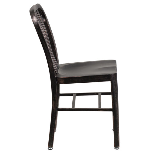 Chair, 500 lb. weight capacity, vertical slat back, galvanized steel, powder coat finish, adjustable floor glides, designed for indoor/outdoor commercial and residential use, black and antique gold (in stock items ship within 24 hours)