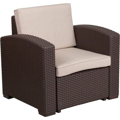 Outdoor Chair, 32-3/4"W x 28"D x 32"H, curved arms, all weather, CA117 fire retardant dense foam, beige removable seat/back cushion, faux rattan, resin frame, plastic block feet, chocolate brown (assembly required) (in stock items ship within 24 hours)