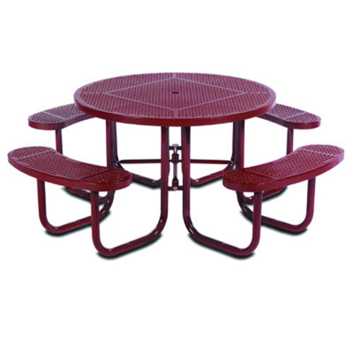 Wabash Signature Picnic Table, 78-9/16" dia. x 29-3/16"H, round, umbrella hole with built in brace, (4) bench seats, round perforated pattern, steel, plastisol coated finish
