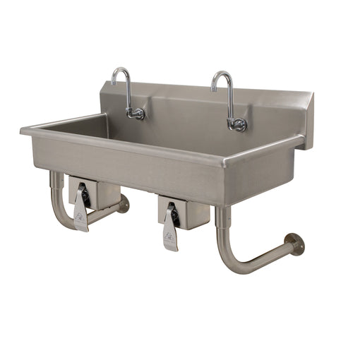 Multiwash Hand Sink, splash mount faucet provision, wall mounted, with knee valve, 40"W x 19-1/2"D x 29-1/2"H (overall), 16" front-to-back x 8" deep (bowl size), 8-1/2"H backsplash, punched with (2) single faucet holes, gooseneck spouts, includes 3-1/2" rear basket drain, 16 gauge 304 stainless steel construction, tubular stainless steel wall supports, NSF