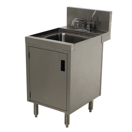 Prestige Hand Sink, underbar, 12"W x 25"D x 36"H (overall), 10"W x 14"D x 7" deep (sink bowl), 7" backsplash, cabinet base with hinged door, stainless steel construction, deck mount faucet with 6" spout, adjustable stainless steel bullet feet, NSF