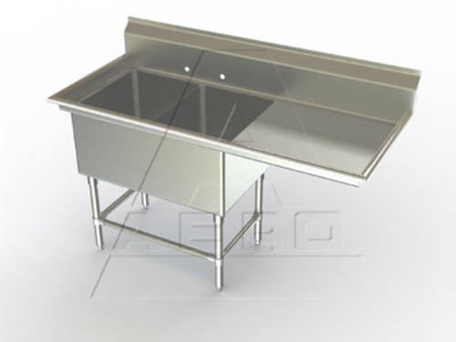 Aerospec™ Sink, two compartment, 68-1/4"W x 36"D x 42-1/2"H, 14/304 stainless steel construction, (2) 20"W x 30" front-to-back x 14" deep fabricated compartments, 24" drainboard on right, 10"H backsplash, 8" OC splash mount faucet holes, raised rolled edges on front & sides, fully welded stainless steel gussets, 16/304 stainless steel legs with front & side cross bracing, adjustable stainless steel feet, Aero Hemmed Safety Edge™, KD, NSF