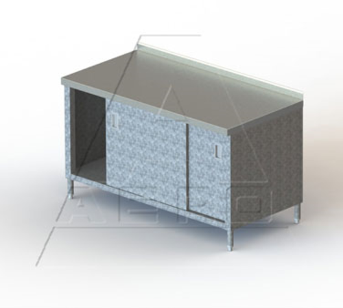 Delux™ Work Table, cabinet base with sliding doors, 144"W x 24"D x 37-3/4"H, 16/304 stainless steel top reinforced with (2) galvanized steel box channels, 2-3/4"H backsplash, sound deadened underside, (2) 18-gauge galvanized steel sliding doors with integral handles & nylon roller bearing sheaves, 18-gauge galvanized steel cabinet body & undershelf, 16-gauge galvanized steel legs with adjustable plastic feet, Aero Hemmed Safety Edge™, shipped KD, NSF