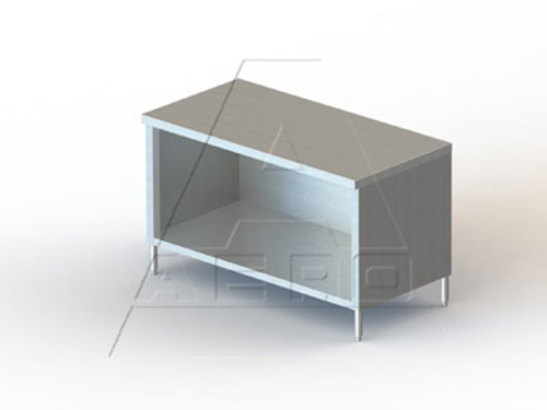 Delux™ Work Table, cabinet base with open front, 144"W x 30"D x 35"H, 16/304 stainless steel top reinforced with (3) galvanized steel box channels, sound deadened underside, 18/430 stainless steel cabinet body & undershelf, 16/304 stainless steel legs with adjustable white metal feet, Aero Hemmed Safety Edge™, shipped KD, NSF