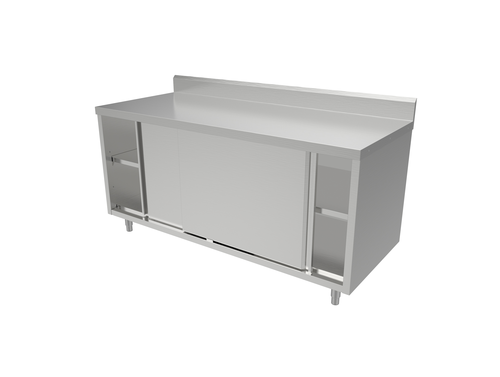 Work Top, cabinet base with sliding doors, 72''W x 30''D x 35''H, 16/304 stainless steel top, with 5'' rear up-turn, 18/430 stainless steel body, top reinforced with welded-on hat channel, sound deadened between top & channels, stainless steel construction, bullet feet, NSF