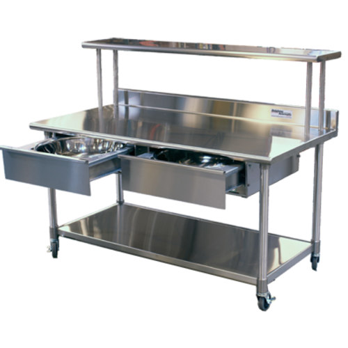ST2 Sugaring & Work Table, 60"W x 30"D top, (2) drawers containing 17" stainless steel sugaring bowls, (1) 12" deep upper storage shelf, (1) undershelf, lockable casters, NSF