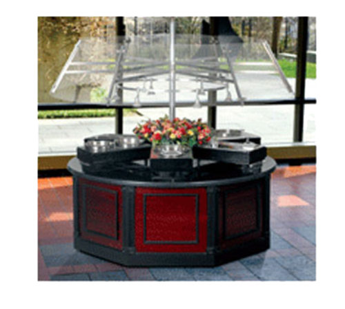 Buffet Station, circular, 6' dia. x 88" H, round, with (6) pan display hub, custom round sneeze guard, 120V lights
