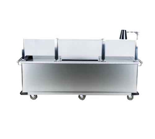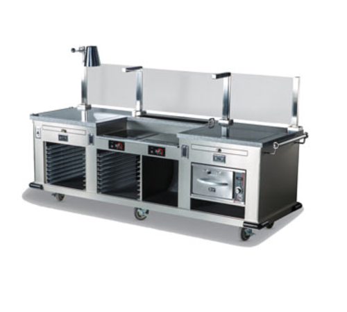 Custom Chef's Table, 34" x 96" x 60", with stainless steel body, features: (2) 16" x 22" radiant heat surfaces, (2) 1800 watt induction stoves (12083), (1) 450 watt warming/holding drawer, (1) 300 watt adjustable heat lamp, (2) slide-out plating/utility shelves, slots for (16) 18" x 26" standard full size sheet pans, insulated ice well, stainless steel vertical food guard with over shelf, (2) 120v 20 amp outlets, (2) 120v/60/1-ph, 30 amps, NEMA, L5-30P