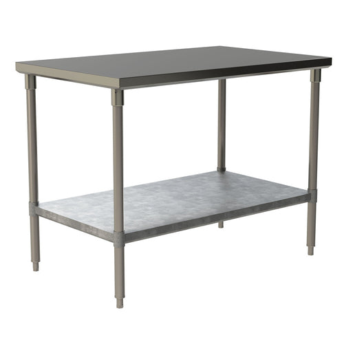 Work Table, 120"W x 36"D x 34"H overall size, 16/304 stainless steel flat top, 18 ga. galvanized adjustable undershelf, stainless steel legs with adjustable stainless steel bullet feet, NSF, Made in USA
