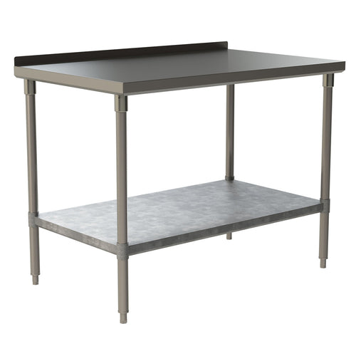 Work Table, 120"W x 24"D x 34"H overall size, 16/304 stainless steel top with 1-1/2"H rear up-turn, 18 ga. galvanized adjustable undershelf, stainless steel legs with adjustable bullet feet, NSF, Made in USA
