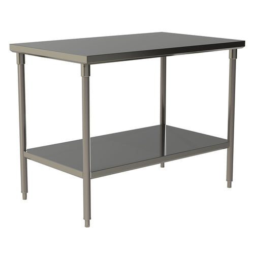 Work Table, 120"W x 30"D x 34"H overall size, 16/304 stainless steel flat top, 18/304 stainless steel undershelf, stainless steel legs with adjustable bullet feet, NSF, Made in USA