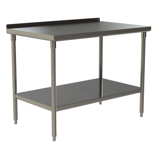 Work Table, 120"W x 24"D x 34"H overall size, 16/304 stainless steel top with 1-1/2"H rear up-turn, 18/304 stainless steel undershelf, stainless steel legs with adjustable bullet feet, NSF, Made in USA