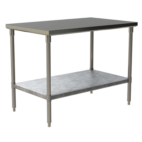 Heavy Duty Work Table, 120"W x 30"D x 34"H overall size, 14/304 stainless steel flat top, 18 ga. galvanized undershelf, stainless steel legs with adjustable bullet feet, NSF, Made in USA