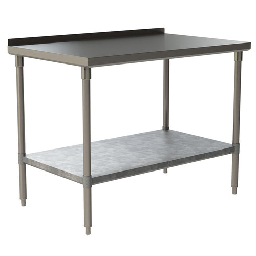 Heavy Duty Work Table, 120"W x 36"D x 34"H overall size, 14/304 stainless steel top with 1-1/2"H rear up-turn, 18 ga. galvanized undershelf, stainless steel legs with adjustable bullet feet, NSF, Made in USA