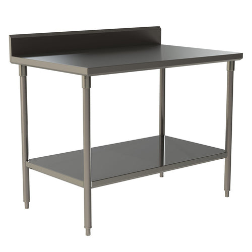 Heavy Duty Work Table, 120"W x 24"D x 34"H overall size, 14/304 stainless steel top with 5" backsplash, stainless steel undershelf, stainless steel legs with adjustable bullet feet, NSF, Made in USA