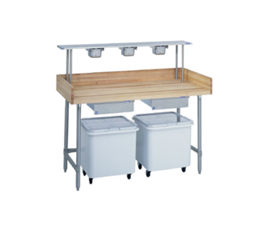 Bakers Table, 1-3/4" thick laminated maple top, 30" wide top, with splash at rear & both sides, 60" long, open base, with (2) ingredient bins, (2) drawers, centered, stainless legs & cross braces, NSF