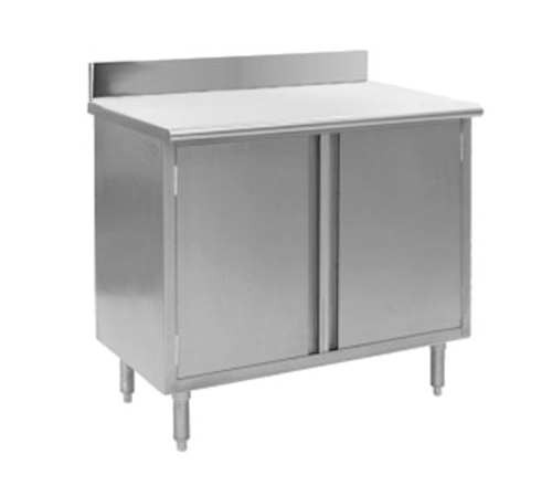 Spec-Master® Series Work Table, cabinet base with hinged doors, 60"W x 24"D, 4-1/2"H backsplash, 14/304 stainless steel top, rolled front edge, (2) hinged doors, Uni-Lok® gusset system, stainless steel cabinet body, legs, & adjustable bullet feet, NSF