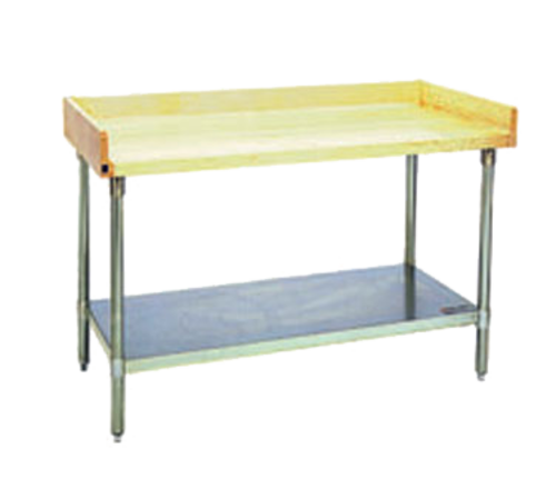 Work Table, baker's top, 60"W x 30"D, 1-3/4" thick hardwood top, 4"H splash on sides & rear, stainless steel gussets, stainless steel undershelf & tubular legs, adjustable stainless steel bullet feet, NSF